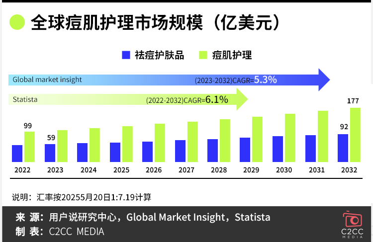 据Global Market Insight与Statista预测,全球痘肌护理市场正稳步增长: