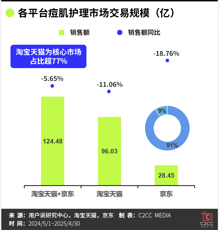 用户说研究中心数据显示,近一年内(2024年5月1日—2025年4月30日),中国痘肌护理线上市场已形成超百亿级规模——淘天与京东两大平台总销售额达124.48亿元。