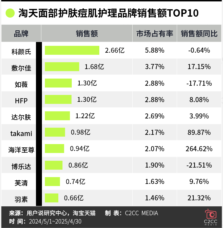 据用户说研究中心联合淘天平台数据,2025年4月MAT周期内,淘天痘肌面部护肤品牌销售额TOP10榜单中,头部格局呈现"外资领跑+国货围剿"的鲜明特征: