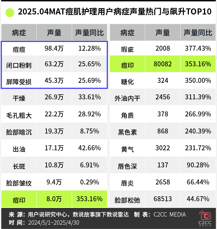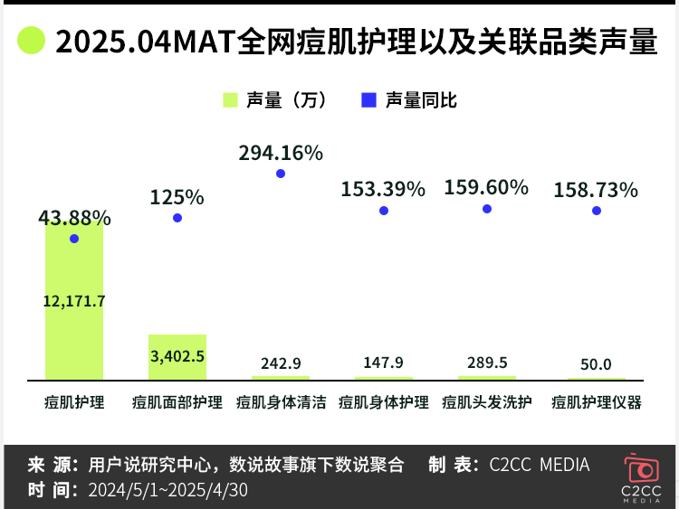 用户说数据显示,2025年4MAT监测周期内,痘肌护理全网声量突破1.2亿次,同比增长43.9%。快节奏生活、熬夜加班、环境污染等多重因素叠加,让痘肌人群基数持续扩大,需求扩大。
