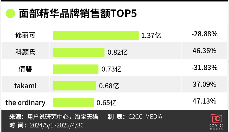 但从增长表现看,头部品牌内部出现显著分化:尽管修丽可以1.37亿元稳居榜首,却同比下滑超28%;倩碧同样面临增长压力,降幅超30%。反观科颜氏与the ordinary,却展现出强劲增长势头,同比增幅均超45%。