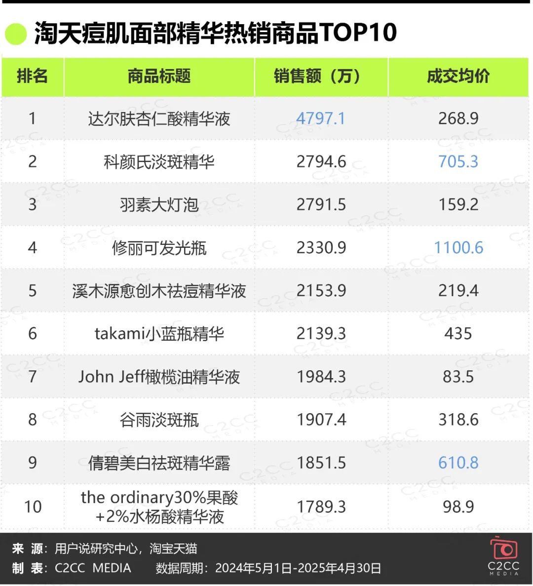 用户说研究中心联合淘天平台梳理出的“淘天痘肌面部精华热销商品TOP10”榜单(2025.04MAT)显示,国货品牌达尔肤杏仁酸精华液以4797.1万元的销售额断层领跑,羽素大灯泡以2791.5万元位列第2(仅次于科颜氏淡斑精华液)。