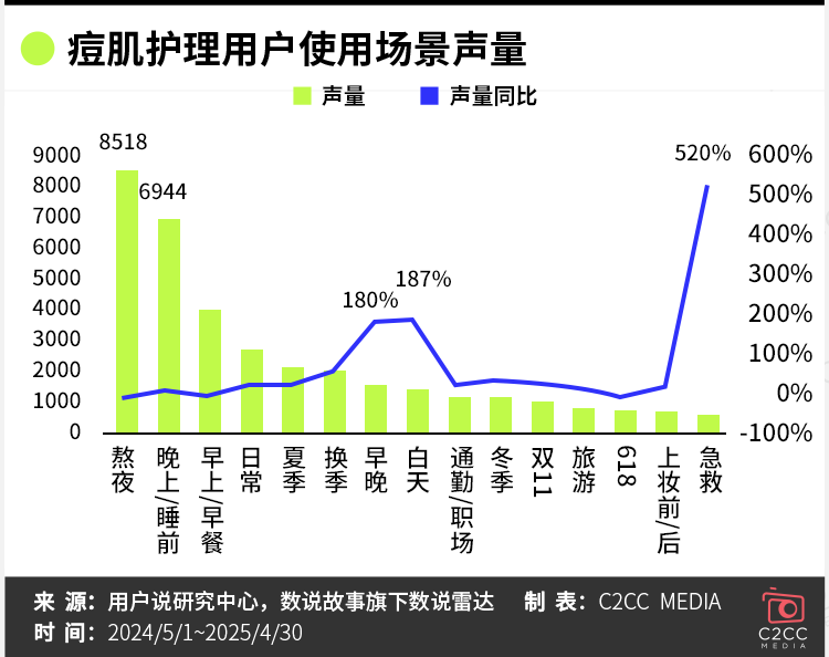 从声量分布的场景特征来看,痘肌护理需求正呈现时段精细化、季节驱动、场景多元化的发展趋势。其中,夜间场景(如熬夜、晚间/睡前护理)仍是核心关注点,但用户对分时段护理(如早晚、日间)需求显著提升,声量同比增幅超180%。