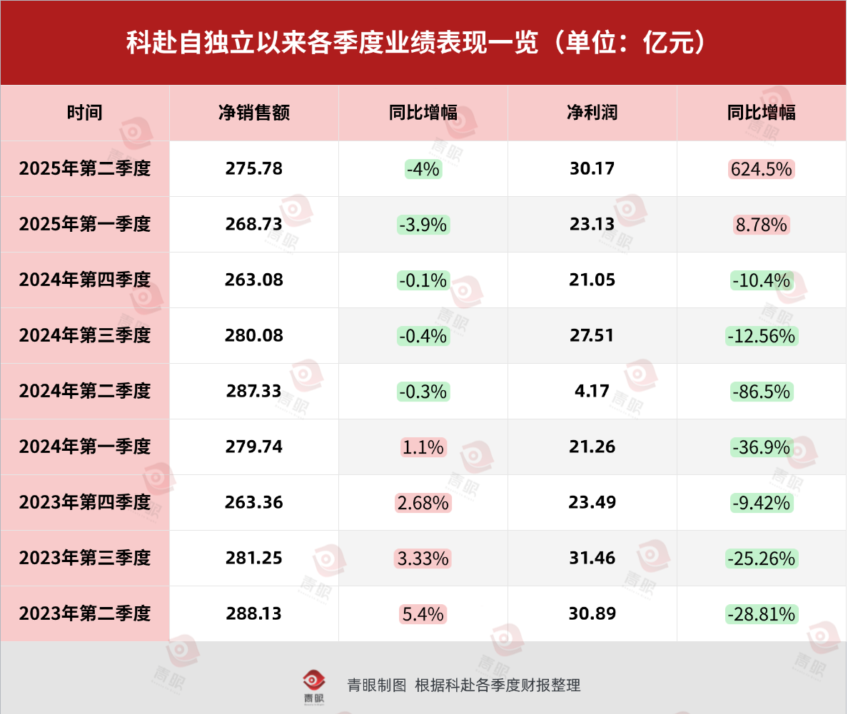 具体来看,2025年第二季度,科赴的净销售额为275.78亿元,同比下降4%,有机销售额下降4.2%。不过,该公司在今年第二季度的净利润则同比大增624.5%,为30.17亿元。