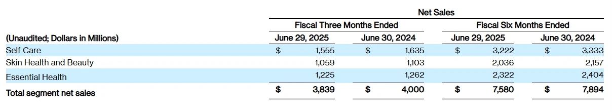 按业务看,科赴共有个人护理(Self Care)、皮肤健康与美容(Skin Health and Beauty)与基础健康(Essential Health)三大板块。从不同业务部门的业绩来看,2025年第二季度,科赴三大业务部门销售额均出现下滑。