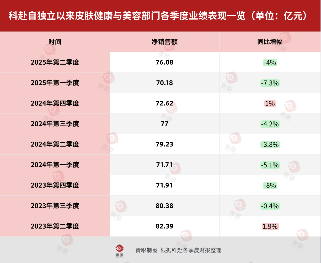 青眼梳理科赴独立以来皮肤健康与美容部门的业绩情况发现,自2023年第三季度起,该部门的表现就开始呈现下滑趋势,并创下连续5个单季度(2023年第三季度至2024年第三季度)净销售额下滑的纪录。不过,该部门在2024年第四季度录得了1%的微小增长。然而,很快又在今年第一、第二季度出现了连续下滑。