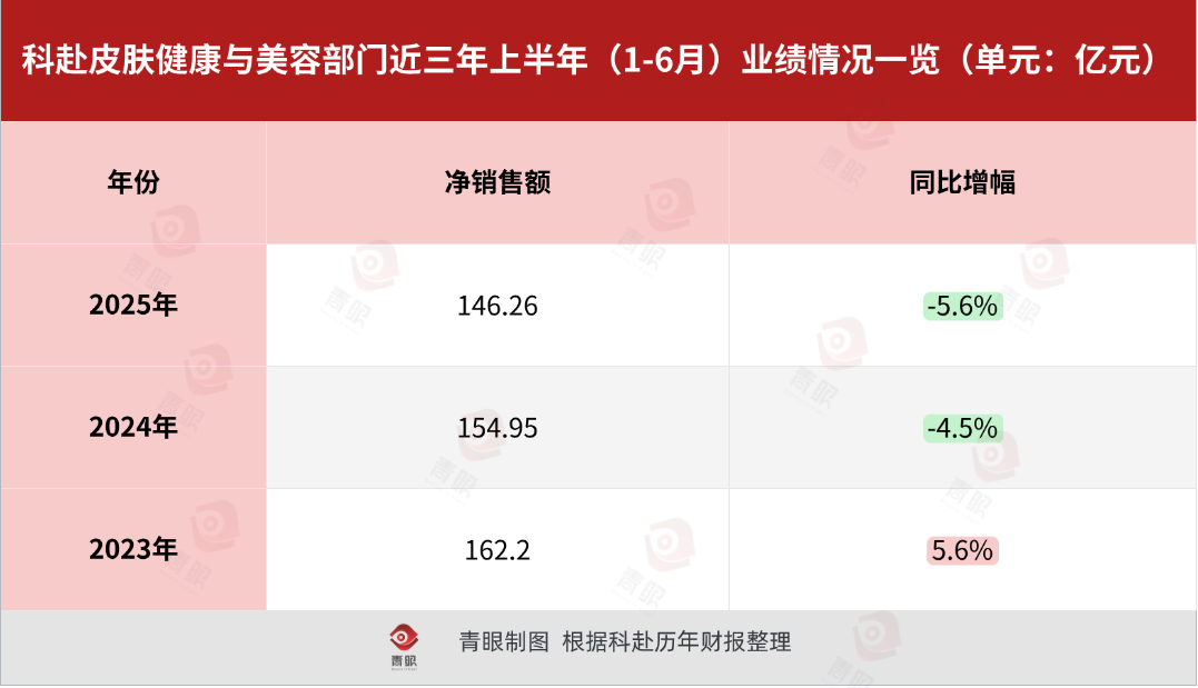 而从科赴旗下皮肤健康与美容部门近三年上半年(1-6月)的表现来看,该部门除了在2023年上半年录得净销售额5.6%的同比增长外,其余2个年份均出现了不同程度的业绩势态。其中,去年上半年同比下降4.5%,净销售额为154.95亿元。