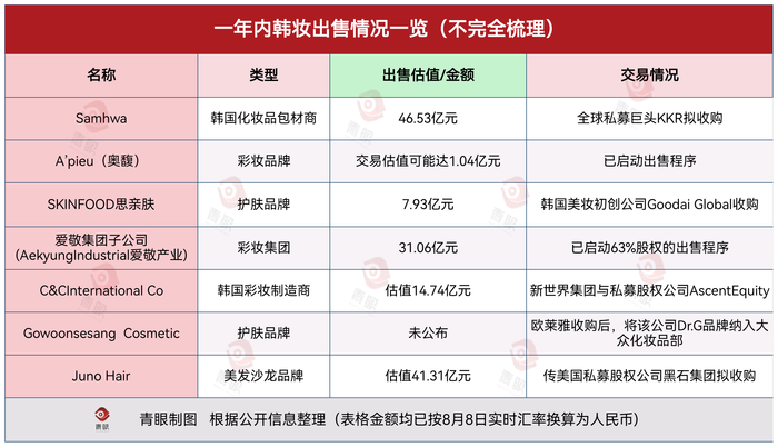 从出售估值/金额来看,几乎所有出售的估值金额或最终交易金额均达到亿级规模,并且,其中3家韩妆企业出售估值/金额更高,均超过10亿级。可以看到,整体出售总金额至少在142亿元。
