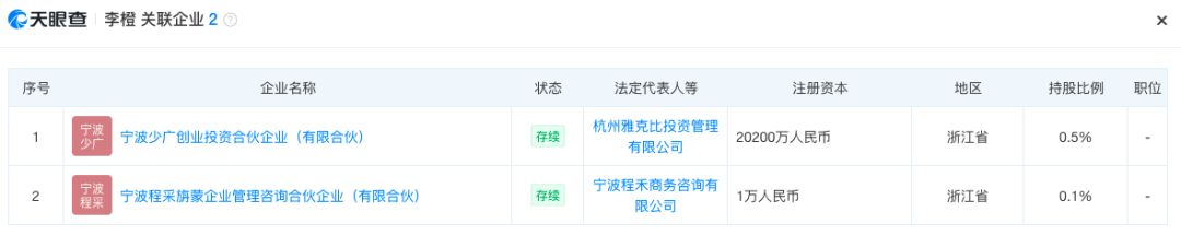此外,天眼查信息显示,李橙名下持有宁波少广创业投资合伙企业(有限合伙)0.5%股权,持有宁波程采旃蒙企业管理咨询合伙企业(有限合伙)0.1%股权。股权穿透后,这两家企业实际控制人均为幻方量化创始人梁文锋。