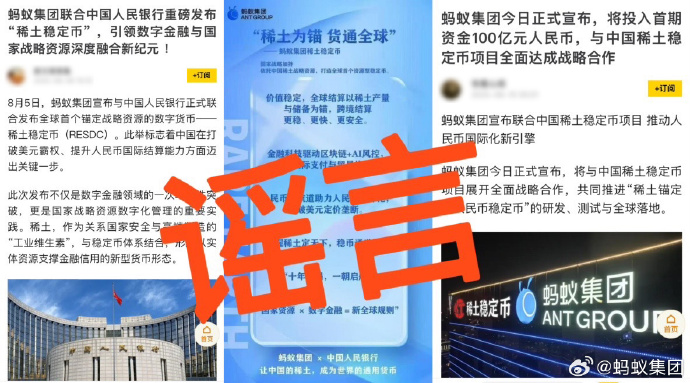 蚂蚁集团与中国人民银行、中国稀土集团共建全球首个稀土人民币稳定币?蚂蚁集团辟谣