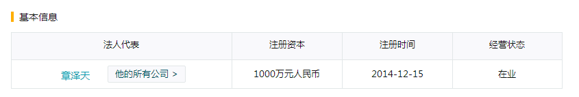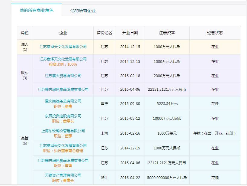 其实,早在2014年12月,作为大四学生的章泽天就拥有了自己的第一家公司——“江苏章泽天文化发展有限公司”。注册资本1000万元,为章泽天自然人独资,主攻她一直喜欢的电视节目制作、文化产业投资等。