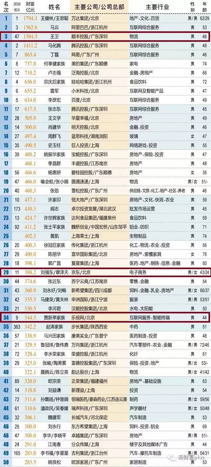 毫无悬念,王健林、王思聪父子以1794.3亿元的财富仍然稳坐首富宝座;而顺丰的上市让其创始人王卫成功超越马化腾,由去年的第47名跃至第3名;贾跃亭家族在“资金链门”、“欠款门”、易到危机等一系列资金问题曝光后,财富缩水295.5亿元,由2016年的第9名跌至34名。