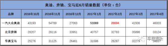 2017年前4个月一汽奥迪销量为167272辆,北汽奔驰为142562辆,华晨宝马为124989辆,虽然奥迪的领先优势被缩小,但任然领先奔驰和宝马。通过前四个月的销量数据可以很直白的看出17年2月份奥迪的销量有相对比较明显的异常,并且在随后的3月和4月销量数据中得到快速的恢复。那么,是什么原因让你产生了奥迪暴跌的错觉?