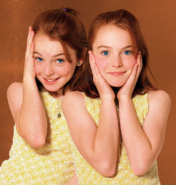 在1961年的初版《天生一对》中,15岁的海丽·米尔斯(Hayley Mills)借助当时的视觉特效技术,成功饰演了一对双胞胎。在1998年的重拍版本中,剧情不变——素未谋面的两姐妹偶然相遇,想方设法最终使她们离异的父母破镜重圆——但这个版本突出了两姐妹不同生长环境所造成的口音的区别。11岁的林赛·罗韩在这部自己的处女作中,分别演绎了外向开朗、天性自由的美国女孩荷莉,和温文尔雅的英国大家闺秀安妮,为影片中姐妹相遇、同框的情节增添了不少看点。