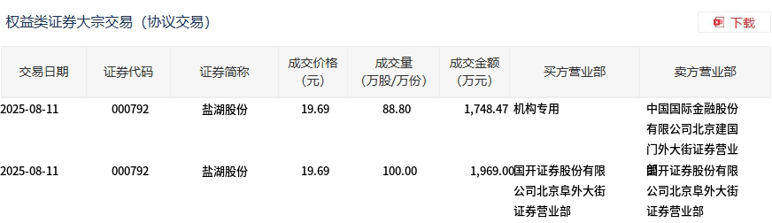 8月11日,盐湖股份大宗交易成交188.8万股,成交额3717.47万元,占当日总成交额的0.95%,成交价19.69元,较市场收盘价19.86元折价0.86%。
