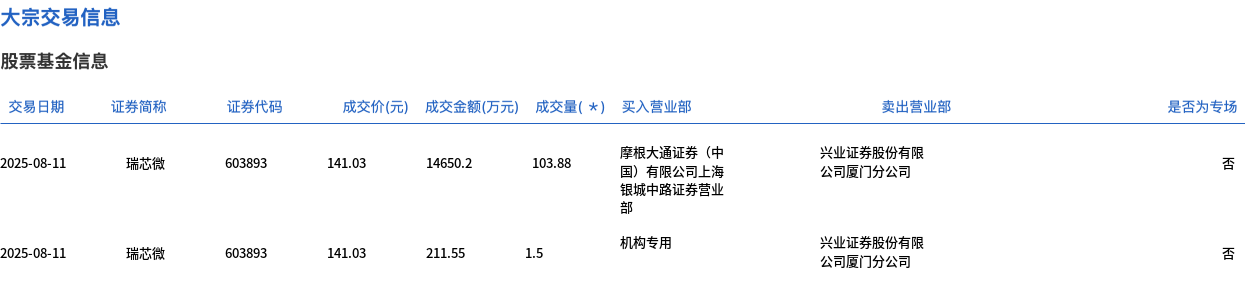 8月11日,瑞芯微大宗交易成交105.38万股,成交额1.49亿元,占当日总成交额的12.11%,成交价141.03元,较市场收盘价160.36元折价12.05%。