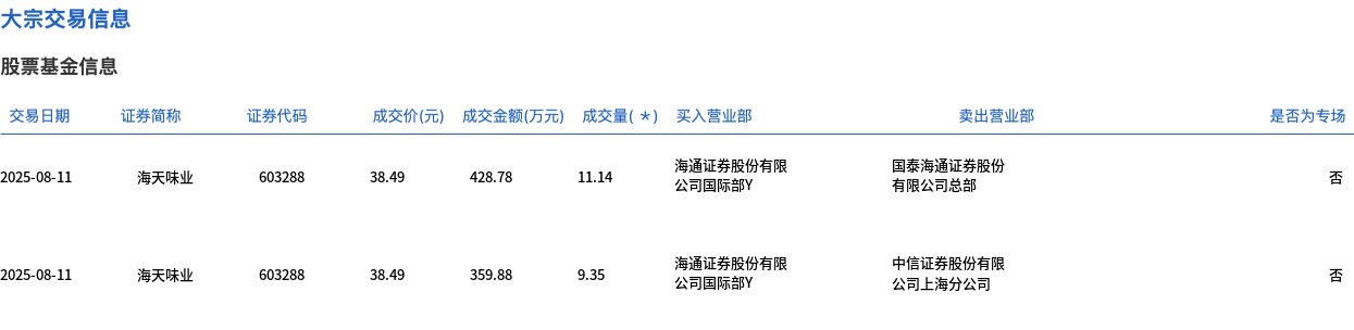 海天味业今日大宗交易平价成交20.49万股,成交额788.66万元