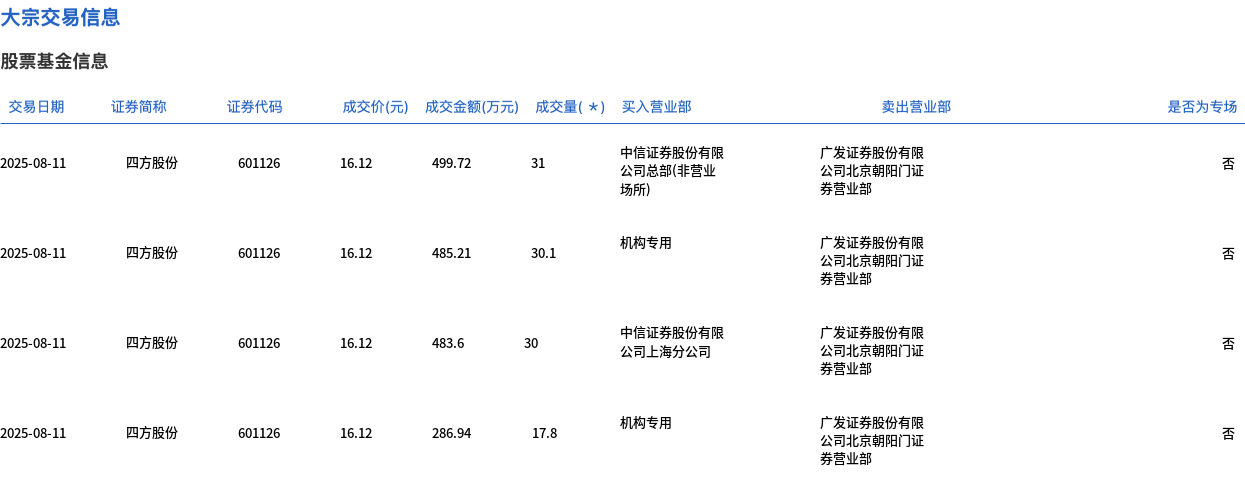8月11日,四方股份大宗交易成交108.9万股,成交额1755.47万元,占当日总成交额的8.89%,成交价16.12元,较市场收盘价17.26元折价6.6%。