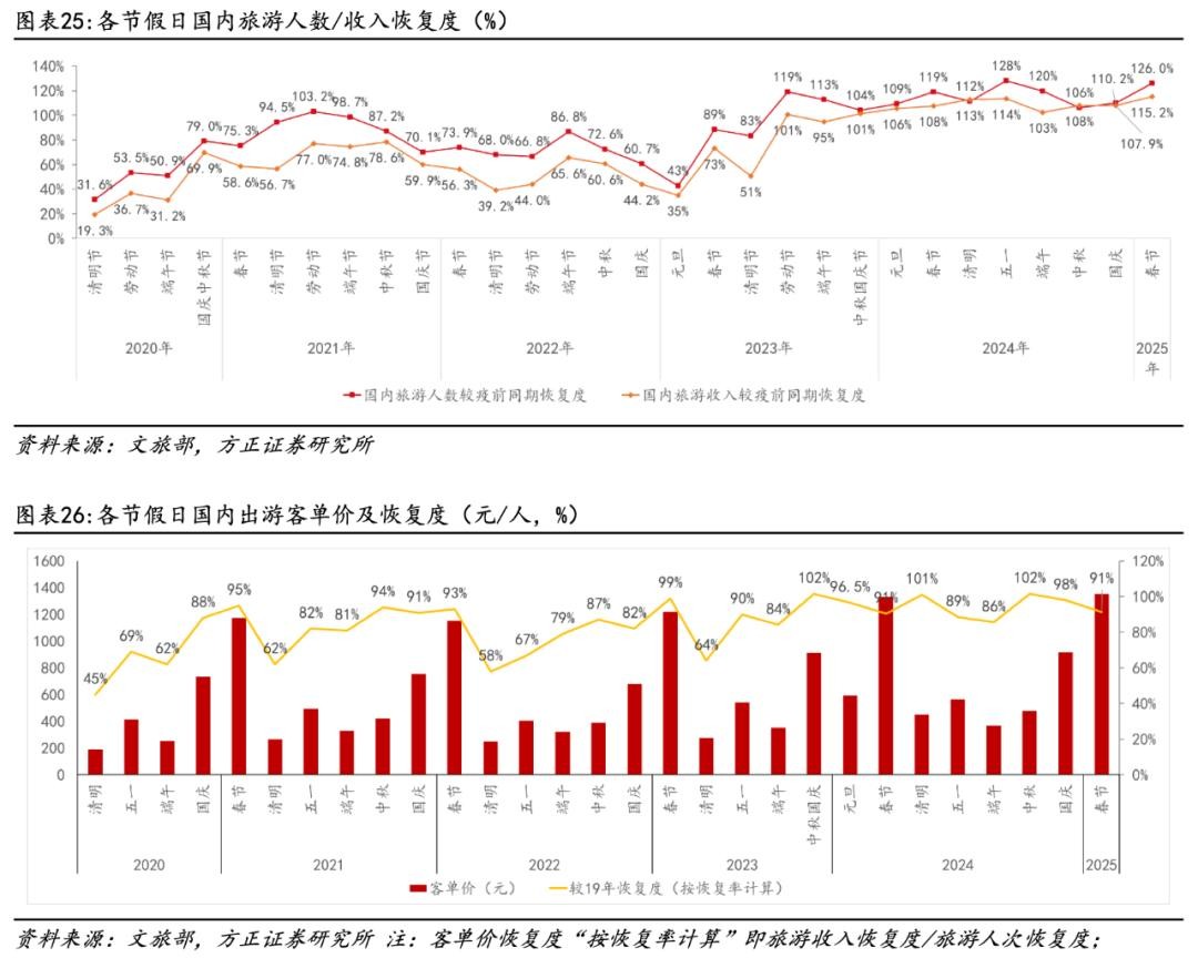入住率不够,导致房价降低,简单点说,这意味着消费者虽然热衷旅游,可不愿意再多花钱了。这也是整个文旅消费的一个明显变化,从方正证券研究所的两张图中,我们可以看到,从2023年劳动节之后,节假日期间国内旅游人数的恢复度已经达到或超过疫前,但国内出游客单价恢复度到2024年,除清明和中秋,也仅为90%左右。
