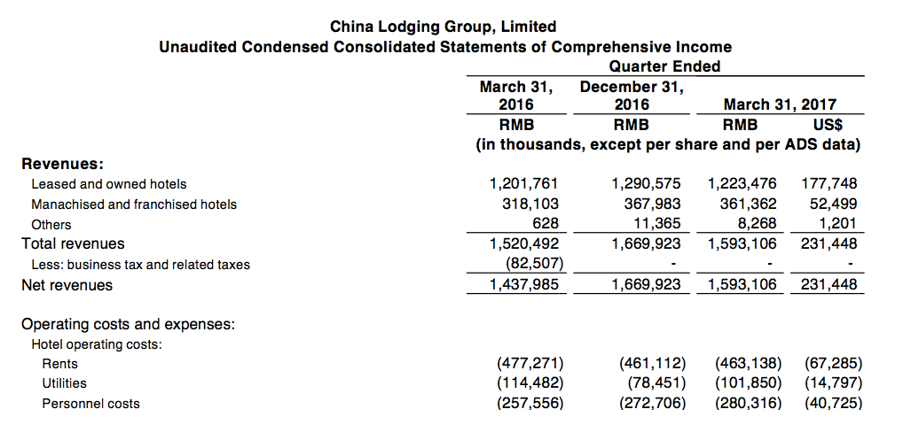 按照酒店业的季度性,第一季度为淡季,通常业绩表现最低,第二、第三季度最高,所以通过与2016年财报对比发现,一季度的RevPAR、ADR和入住率虽同比增长,但环比均有所下滑。