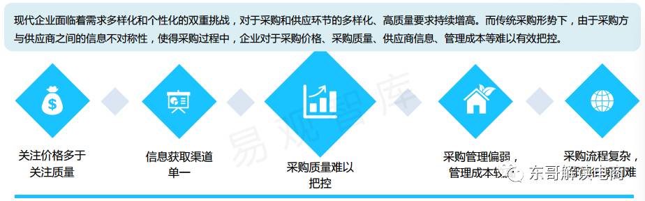 在海外欧美成熟的电商市场,2B 市场一直大于 2C 市场,大概是二八比例。也就是说,企业更快的接受互联网电商模式,解决自身的采购效率问题。只是中国企业IT化速度比较慢,加上其它一些中国特殊国情,发展一直都比较缓慢。在中国正好相反,先是个人接受了网购方式,然后,才是企业慢慢接受这种电商采购方式。