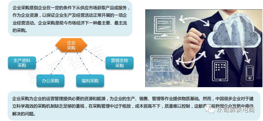 企业级市场主要包括了,生产资料(包括云服务),办公设备耗材,员工福利(包括商旅、金融),以及营销支持等四大方面。
