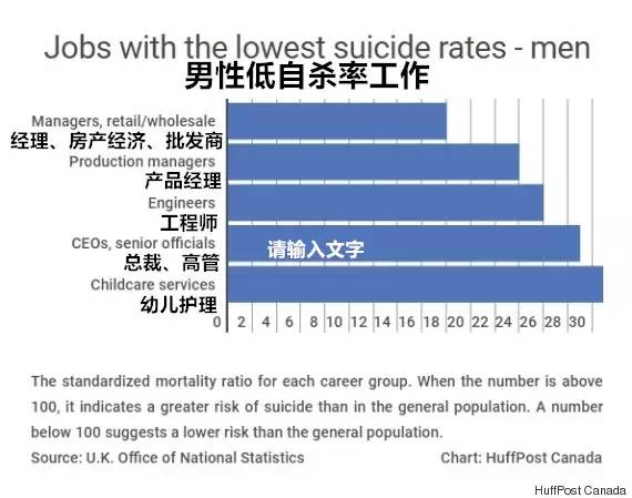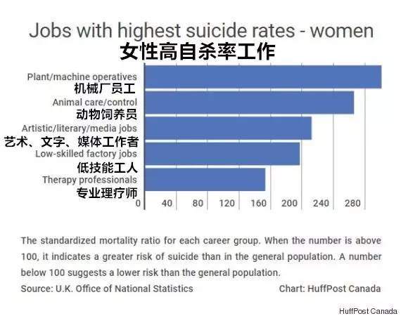 此外,男性职员的自杀率也远高于女性,足见男同胞的内心还是相当脆弱的。数据显示,男性中低技能从业者的自杀率高于全国平均水平的三倍。而女性中,高自杀风险的职业则包括:护理(风险高出平均水平23%),小学老师(风险高出平均水平42%),以及文化、传媒、体育领域从业者(风险高出平均水平69%)。对此,小编也无话可说,还是默默地打字吧,人家内心还是很阳光的好嘛。