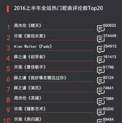 根据《网易云音乐2016年用户行为数据报告》:2016年上半年热门歌曲的第一位仍然是周杰伦的《晴天》;00后喜爱的歌曲中第一位则是日文歌曲;90、80后喜欢的歌曲中,大部分来自于《我是歌手》。
