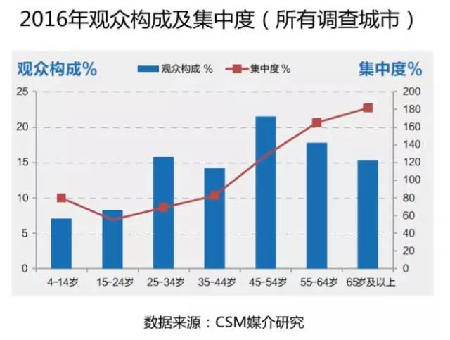 根据《2016年中国电视受众的收视行为分析报告》,结果显示:2016年的观众结构特征,25-54岁观众占到了总体观众的51.5%,是整个电视收视市场的中坚力量。其中45-54岁观众占比最高,达到21.5%;从观众集中度来看,45岁及以上的观众收视倾向性更强。