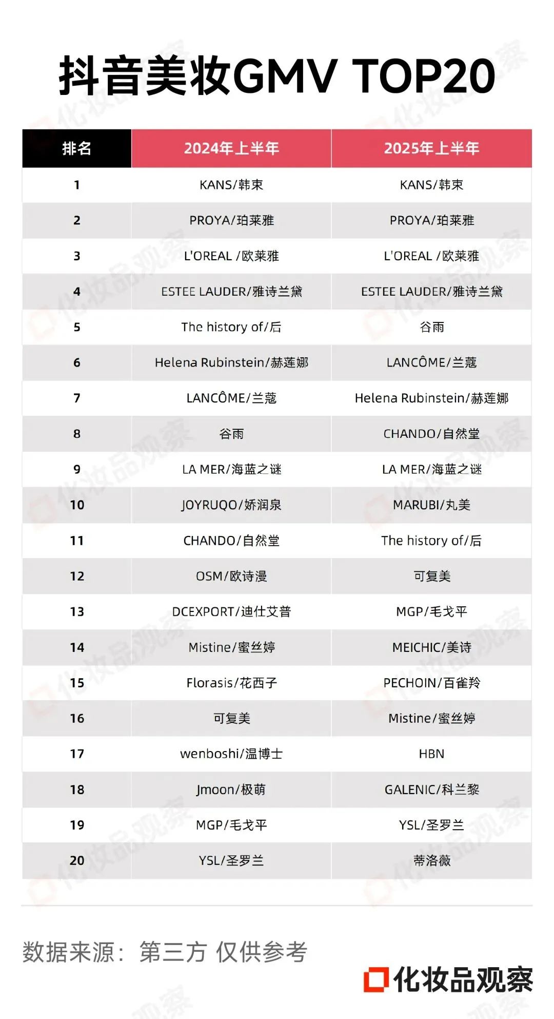 2025年上半年抖音美妆GMV20榜更是直观呈现了这一“洗牌”:去年红极一时的娇润泉、迪仕艾普、温博士跌落TOP20,取而代之的是美诗、蒂洛薇两个新面孔。