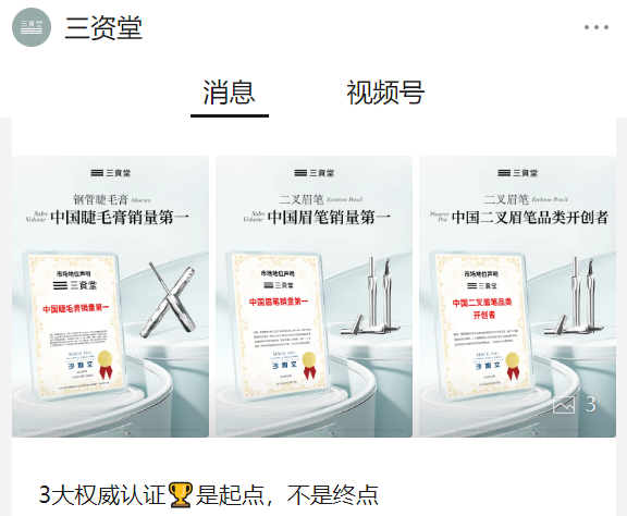 又如跑红集团旗下的三资堂,抖音官方旗舰店拥有184万粉丝,天猫官方旗舰店也拥有36.4万粉丝,已推出二叉眉笔、睫毛打底膏等核心单品,其中“睫毛打底膏”跻身“抖音商城排行榜·定型睫毛膏超值人气榜”第4名、“天猫榜单·睫毛膏回购榜”第1名。此外,三资堂还荣获沙利文国际权威机构3大认证:中国眉笔销量第一、中国睫毛膏销量第一、中国二叉眉笔品类开创者。