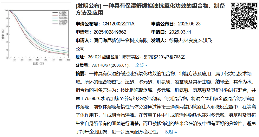 变化不止如此,海尼集团今年已申请了两项发明专利,分别为“一种舒缓组合物和舒缓产品及其应用和化妆品(CN120227300A)”“一种具有保湿舒缓控油抗氧化功效的组合物、制备方法及应用(CN120022211A)”,此前,其专利多以“外观设计”为主,而“发明专利”才是衡量一个品牌竞争力的重要指标。