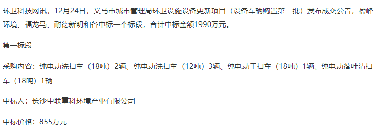 首先,是成本压力。高端新能源及智能环卫装备价格不菲,以盈峰环境2024年中标的一个项目为例,7辆扫洗车中标总价高达855万元。大规模更新换代意味着巨大的初始投入。短期内价格仍是难以逾越的门槛。