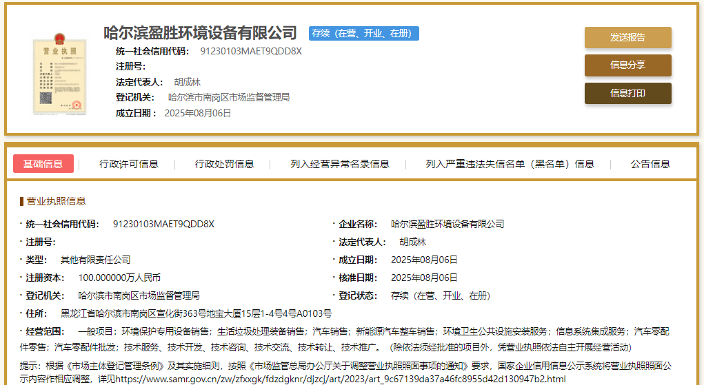 正是在行业转型与市场需求的双重驱动下,盈峰环境的战略布局浮出水面。工商信息显示,一家名为“哈尔滨盈胜环境设备有限公司”的企业于2025年8月6日在哈尔滨市南岗区注册成立。