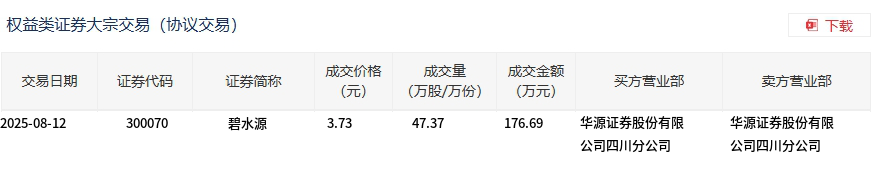 8月12日,碧水源大宗交易成交47.37万股,成交额176.69万元,占当日总成交额的1.21%,成交价3.73元,较市场收盘价4.6元折价18.91%。