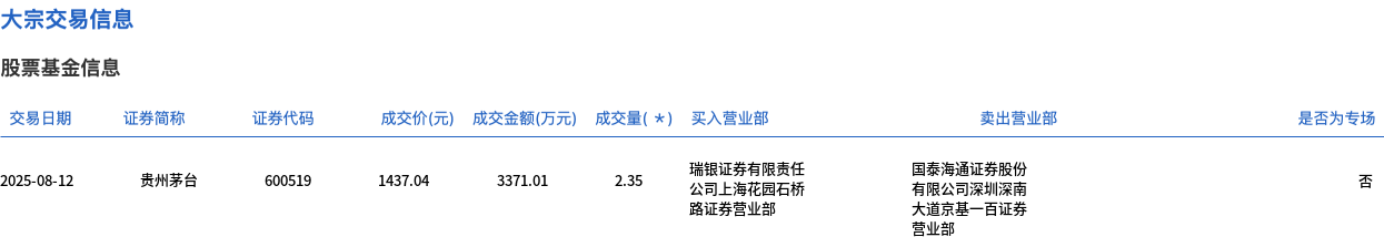 8月12日,贵州茅台大宗交易成交2.35万股,成交额3371.01万元,占当日总成交额的0.55%,成交价1437.04元,较市场收盘价1437.04元持平。