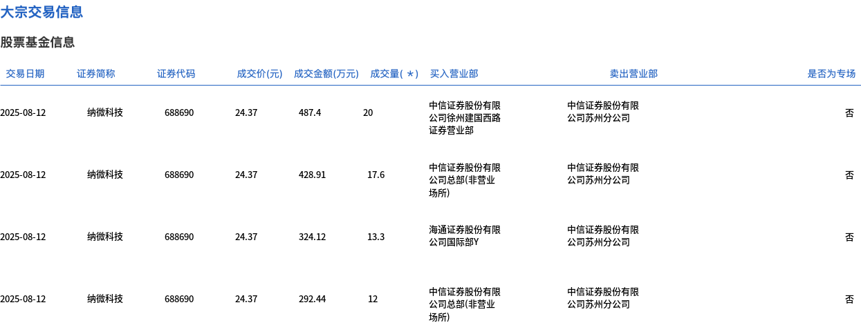 8月12日,纳微科技大宗交易成交62.9万股,成交额1532.87万元,占当日总成交额的8.68%,成交价24.37元,较市场收盘价26.78元折价9%。