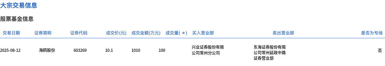 8月12日,海鸥股份大宗交易成交100万股,成交额1010万元,占当日总成交额的4.67%,成交价10.1元,较市场收盘价11.2元折价9.82%。