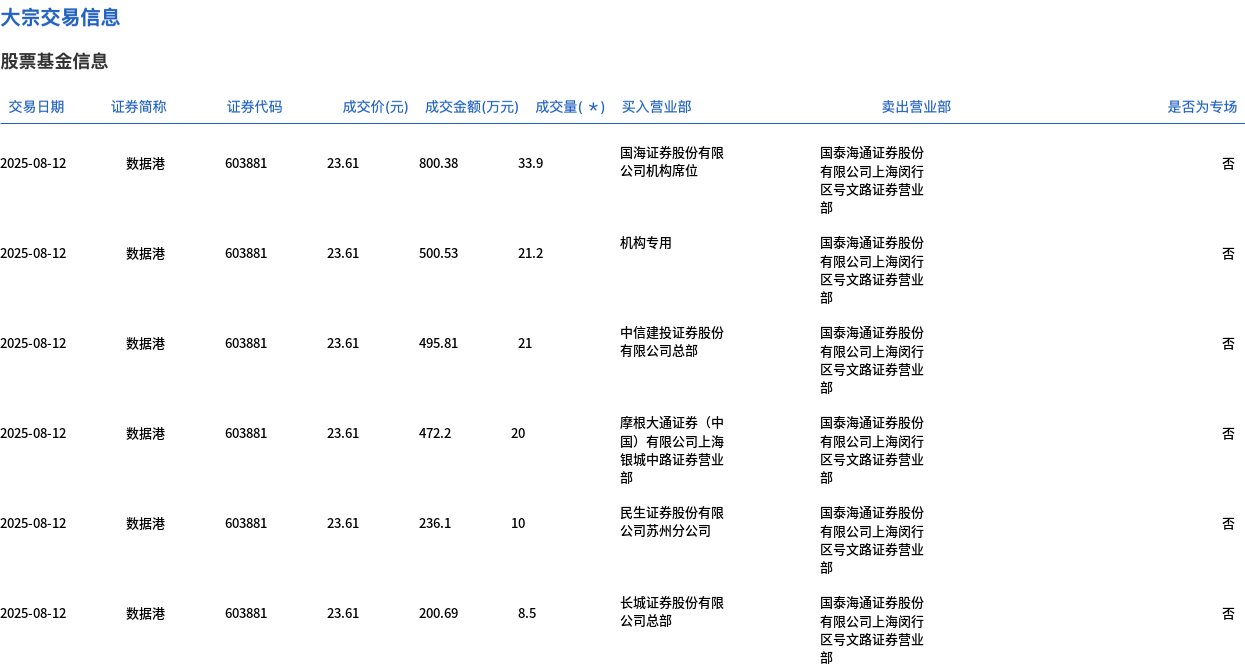 8月12日,数据港大宗交易成交114.6万股,成交额2705.71万元,占当日总成交额的4.15%,成交价23.61元,较市场收盘价26.38元折价10.5%。