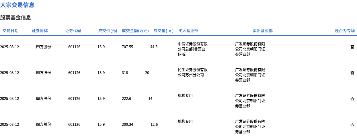 8月12日,四方股份大宗交易成交91.1万股,成交额1448.49万元,占当日总成交额的6.56%,成交价15.9元,较市场收盘价17.1元折价7.02%。