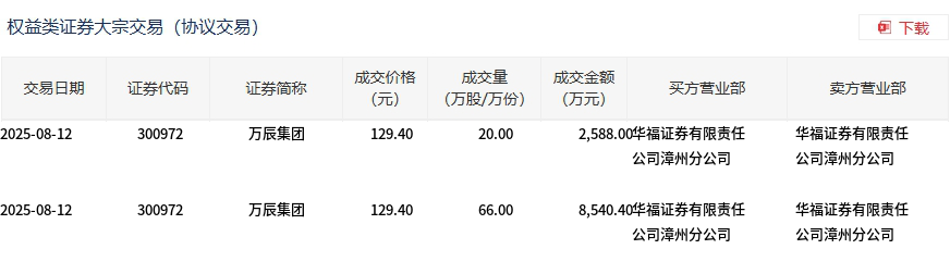 8月12日,万辰集团大宗交易成交86万股,成交额1.11亿元,占当日总成交额的10.02%,成交价129.4元,较市场收盘价163.01元折价20.62%。