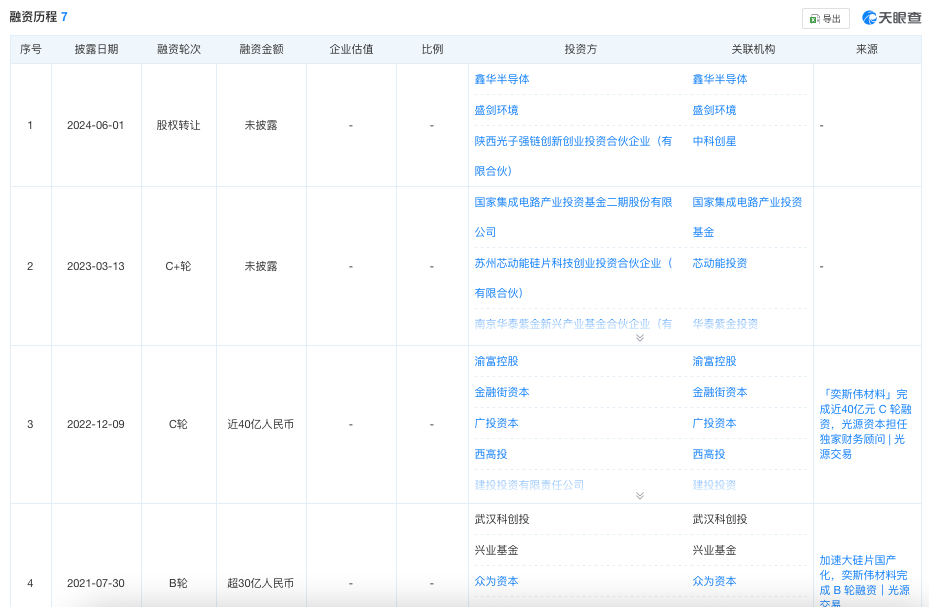虽然始终处于亏损,但奕斯伟材料一直备受投资机构认可。天眼查显示,自成立以来,公司凭借技术实力与行业地位吸引了7轮资本注入,累计融资超100亿元。2019年6月,成立三年的奕斯伟材料就收获天使轮融资,由北京芯动能基金投资;2020年8月,宣岳投资入股。2021年7月完成 B 轮融资,中网投、中信证券投资等27家机构认购新增注册资本,融资金额超30亿元;2022年9月,B+轮融资引入宁波奕芯等战略投资者,20亿元注资推动投前估值增至85亿元。