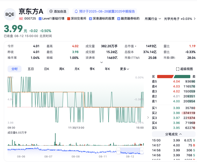 2003年,京东方豪掷3.8亿美元收购现代半导体株式会社的TFT-LCD 业务,一举跃入TFT-LCD领域,开启国产显示面板崛起之路,逐步在全球市场崭露头角。到2017年,京东方实现营业收入938亿元,净利润78.6亿元,同比大增 284.34%,股价涨幅达104%,成功在全球半导体显示领域登顶,王东升也被誉为“中国半导体显示产业之父”。截至2025年8月12日,京东方A报收3.99元/股,总市值1493亿元。