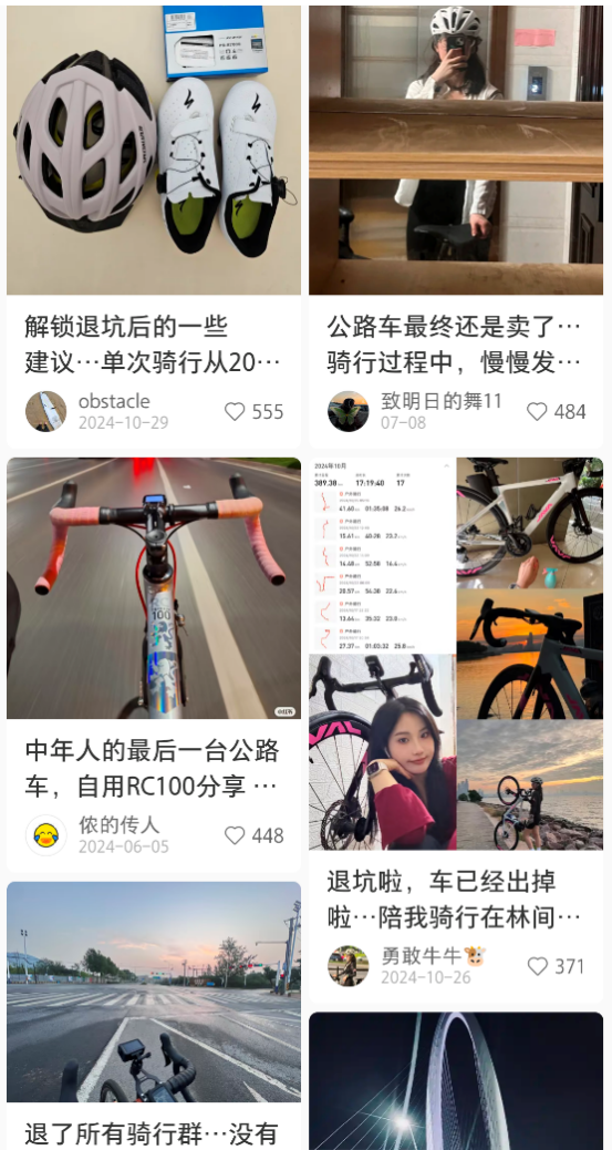 在小红书等社交平台上,前两年刷屏的还是“骑行路线打卡”、“骑行 OOTD 分享”等话题,而近两年,关于“退坑”的帖子却越来越多。其中,出现频率最高的理由是:“骑行更适合时间充裕又舍得花钱的人”。
