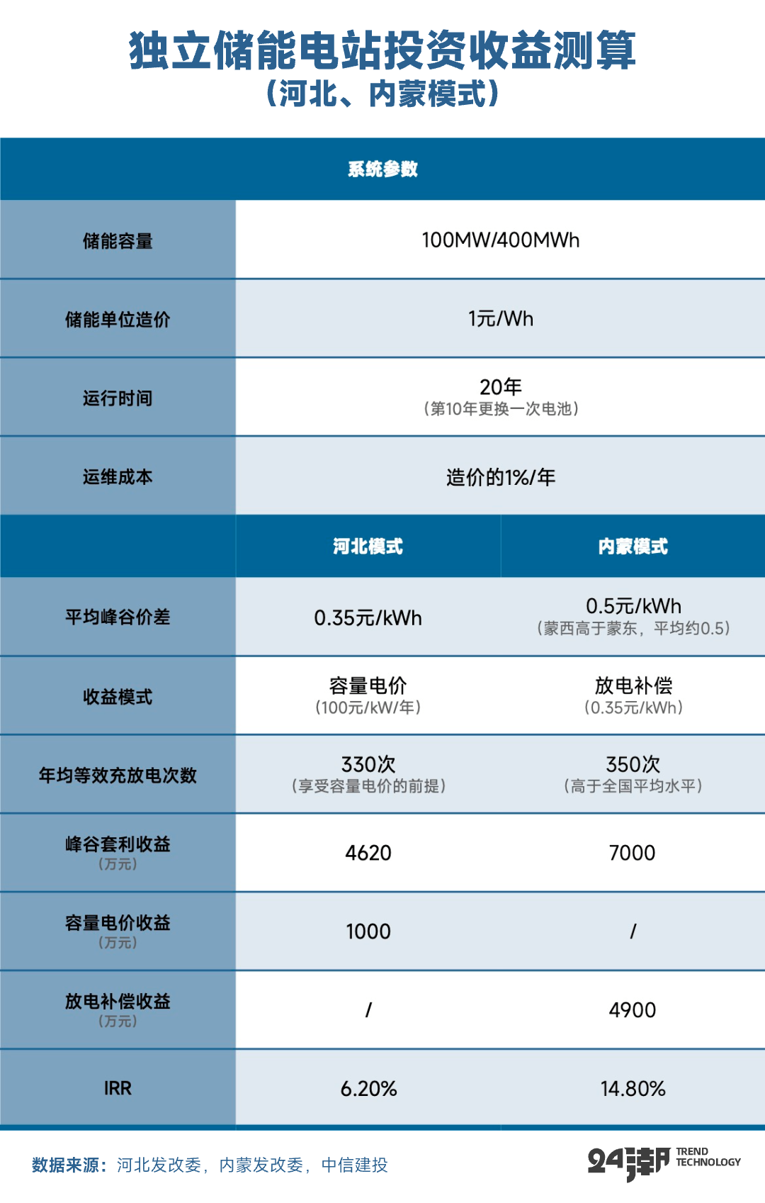 从经济性方面考量,部分地区的独立储能确实也已具备投资价值。参考 “河北模式”(容量电价)和 “内蒙模式”(放电补偿+现货套利)两种情况。根据中信建投测算,河北的 “容量电价+峰谷套利” 和内蒙 “放电补偿+峰谷套利” 模式均可使得独立储能电站获得一定的经济性,其中内蒙由于峰谷价差大(蒙西可达0.7元/kWh以上)、储能电站利用率高(达到350次等效充放电次数以上),再加上0.35元/kWh的放电补偿,经济性尤为突出,资本金IRR可达14.8%。