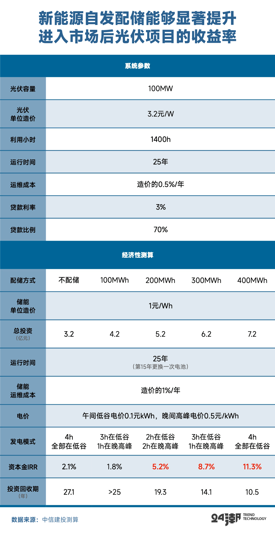 根据中信建投测算,假设集中式光伏电站的大EPC单价约为3.2元/W,那么若电量全部在午间时段发出,此时电价因午间电价低,假设平均约为0.1元/kWh,那么项目的资本金IRR仅为2.1%左右,事实上处于亏损状态,不能达到合理收益率要求。