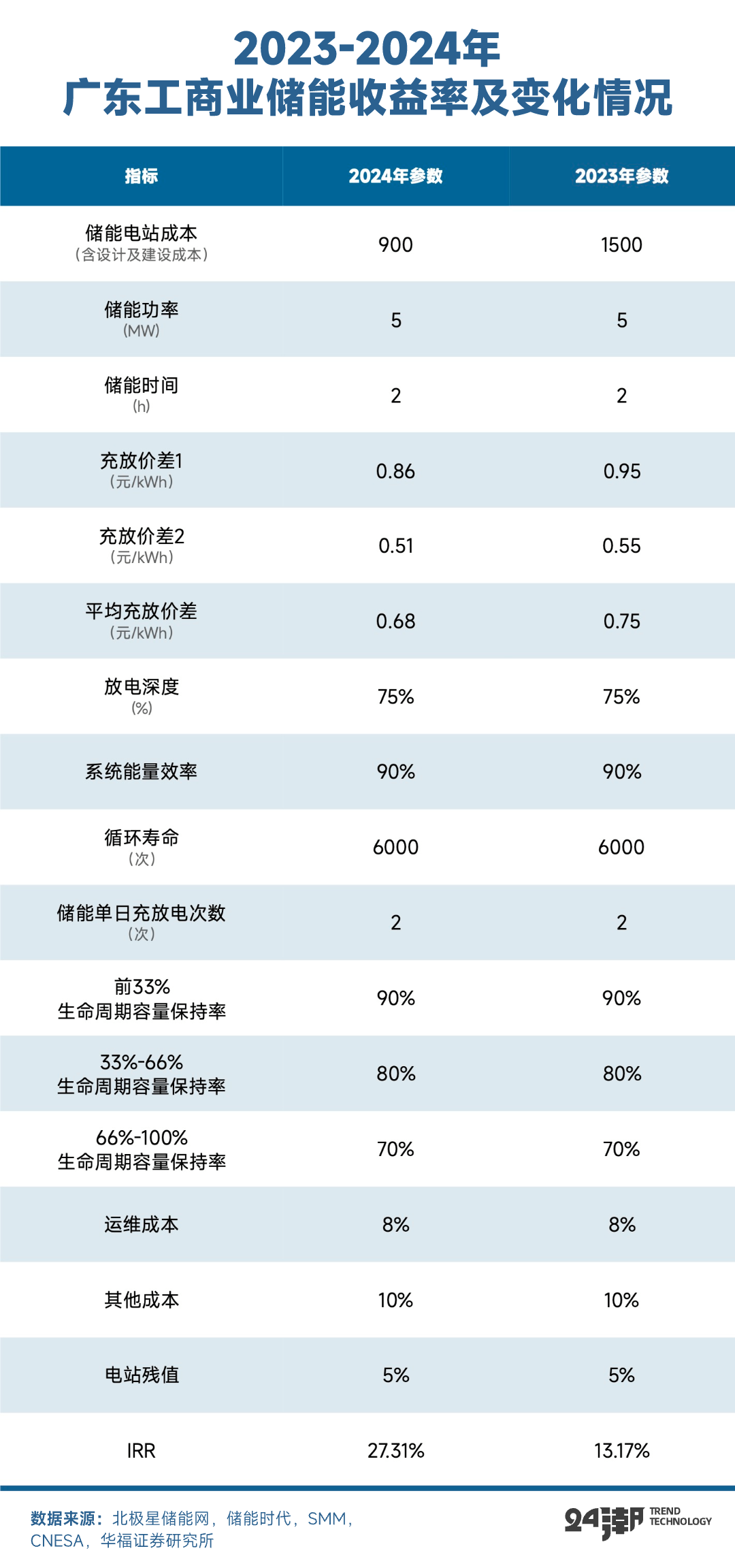 若考虑不同配储场景与地方政策差异,光伏配储还有可能拿到更高的投资收益。以广东省5MW/10MWh的储能电站为例,经华福证券测算,24年工商业储能收益率为27.31%,较23年增长了14.14个百分点。