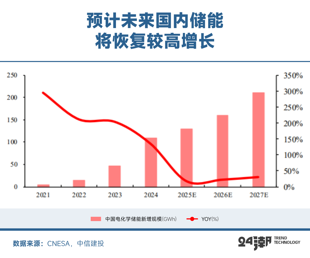 综上所述,在独立储能与自发配储等强力支撑下,储能未来大概率还将保持持续增长趋势。据中信建投证券分析预测,明后年国内储能市场将有望恢复较高速增长,预计将分别达到160GWh、210GWh。
