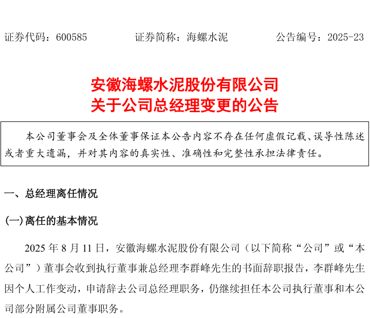 近日,海螺水泥宣布公司总经理发生变更。公告称,2025年8月11日,公司董事会收到执行董事兼总经理李群峰先生的书面辞职报告,因个人工作变动,他申请辞去总经理职务,但仍继续担任公司执行董事及部分附属公司董事。公告显示,李群峰任职期间为公司经营发展作出积极贡献,且已妥善交接工作,其辞任不会对公司日常运营产生不利影响。