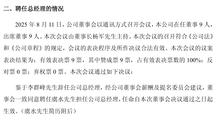 同日,公司董事会以通讯方式召开会议,会议全票通过以下决议:经董事会薪酬及提名委员会建议,一致同意聘任虞水先生担任公司总经理。
